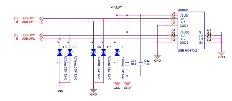 I had to make a similar scheme, only on the components available to me (instead of RClamp0531T or ESL100503, I used PESD5V0S1BA.115) and the flash drives worked. There is still a problem with the camera. Looking for a solution further.