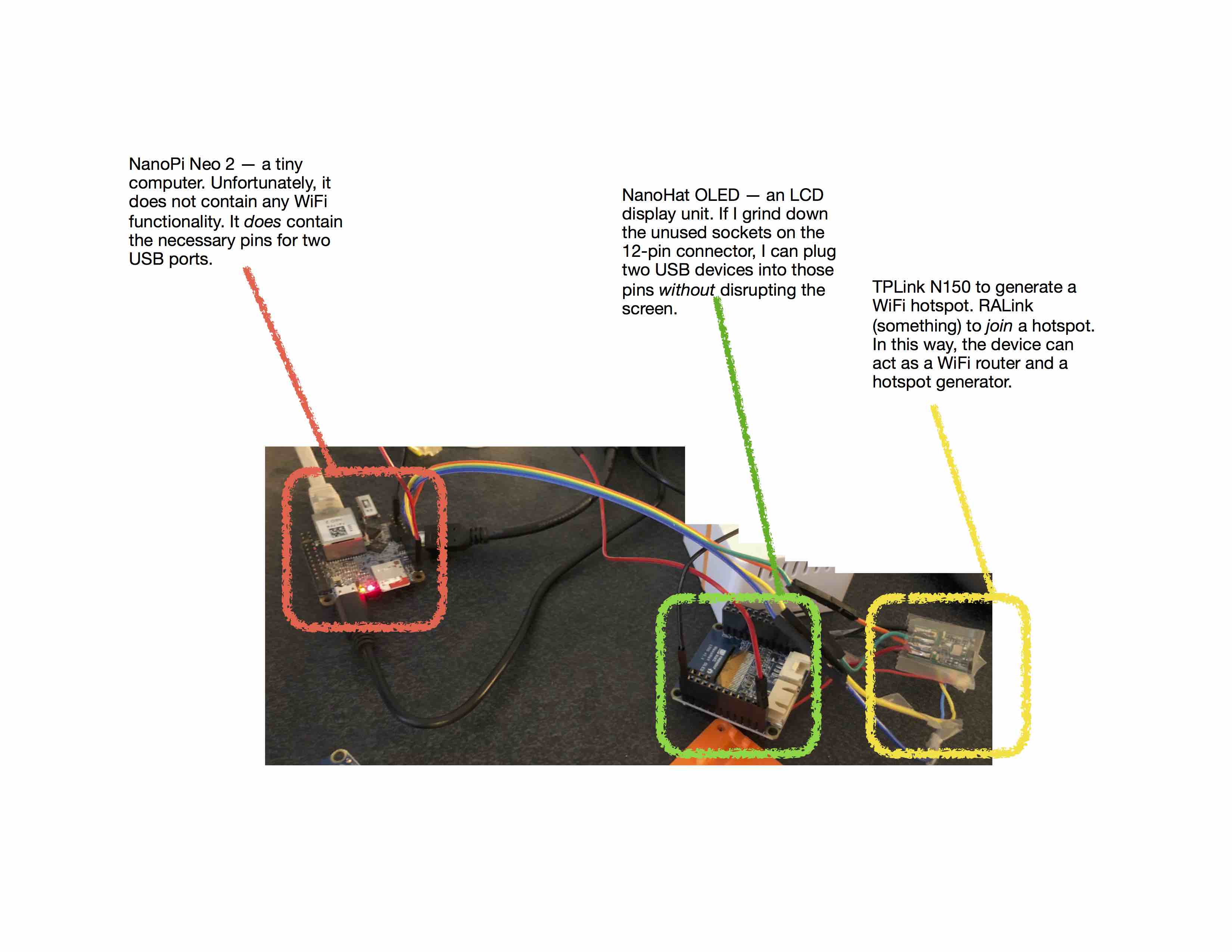 As you can see below, the device is not quite finished... but the two WiFi adapters work. I'm trying to figure out how to attach them permanently. Anyway, the only problem remaining (other than the dm-crypt issue) is the matter of making hostapd recognize and use one of them as a WiFi access point. I'll get back to it.