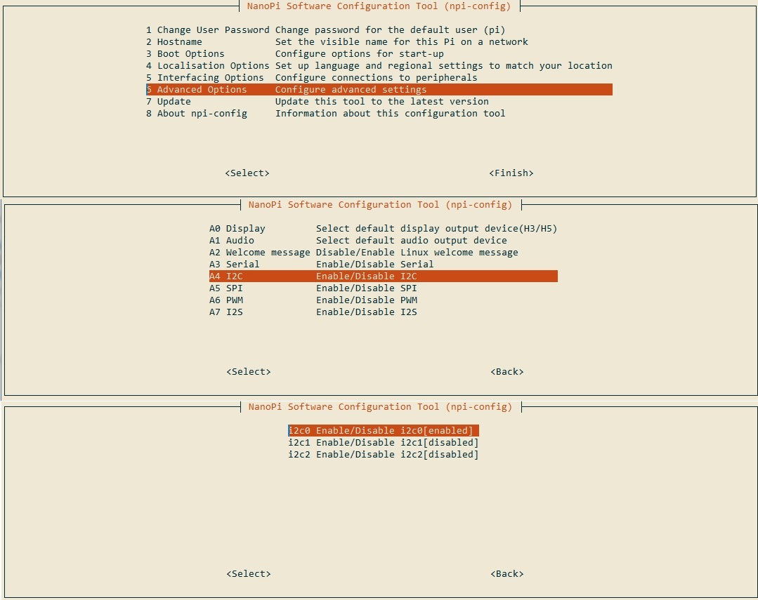 Now we take a look at the NanoPi Software Configuration Tool (npi-config), because we want to know I2C is enabled, or we have to do so.