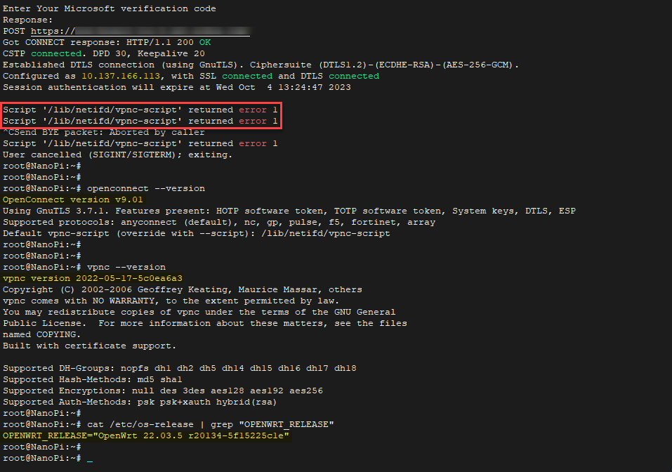 I'm trying to connect to a VPN server using the OpenConnect via CLI, but I'm getting an error related to the VPNC: