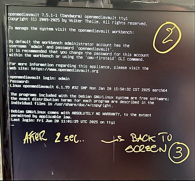 Felix - Did you resolve this issue? I have a similar problem. I boot from an SD card and use the default userid and Password. As with you a few lines flashes by and I am back at the login page.